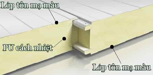 Consists of 3 layers: Top layer: made from aluminum-zinc alloy color-coated steel that can resist oxidation, antibacterial and corrosion with an average thickness of 0.4mm – 0.6mm. The thickness of this base layer depends on each function of the project to be able to choose the appropriate type. Middle layer: is a PU foam layer (Polyurethane) with the effect of insulation, heat insulation, sound insulation. Bottom layer: similar to the top layer, the bottom layer of the PU Panel is also made of aluminum-zinc alloy color-coated steel to ensure anti-corrosion and anti-oxidation.